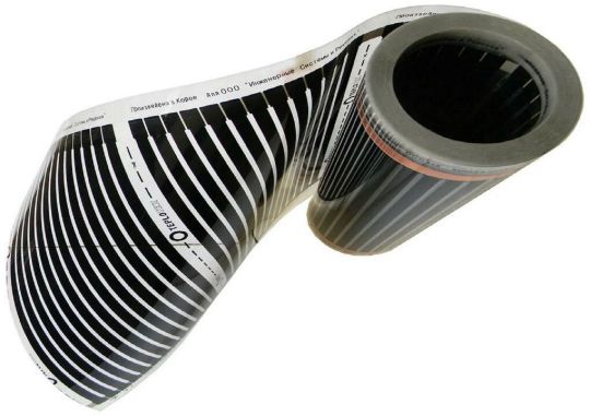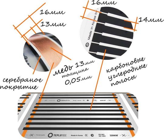 Пленочный теплый пол «Teplotex» представляет собой непосредственно нагревательный элемент – полосы из карбоновой пасты, расположенные между полупроводниками из меди и запаянные между двумя слоями полимерной плёнки из полиэтилентерефталата.